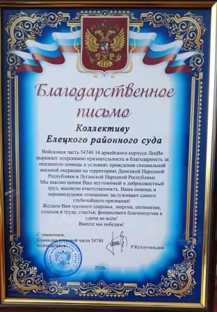 Мы засыпаем и просыпаемся в тёплых постелях, кушаем домашнюю еду, выходные проводим с друзьями исемьей - и всё это благодаря тем, кто находится на передовой. И долг каждого, кто находится в тылу, помочь солдатам приблизить победу... 19.02.2025 г. в Елецком районе прошёл первый слёт военных волонтёров. Благодарственное письмо за оказанную помощь участникам специальной военной операции от командира войсковой части 54740 вручили коллективу Елецкого районного суда ![]() |